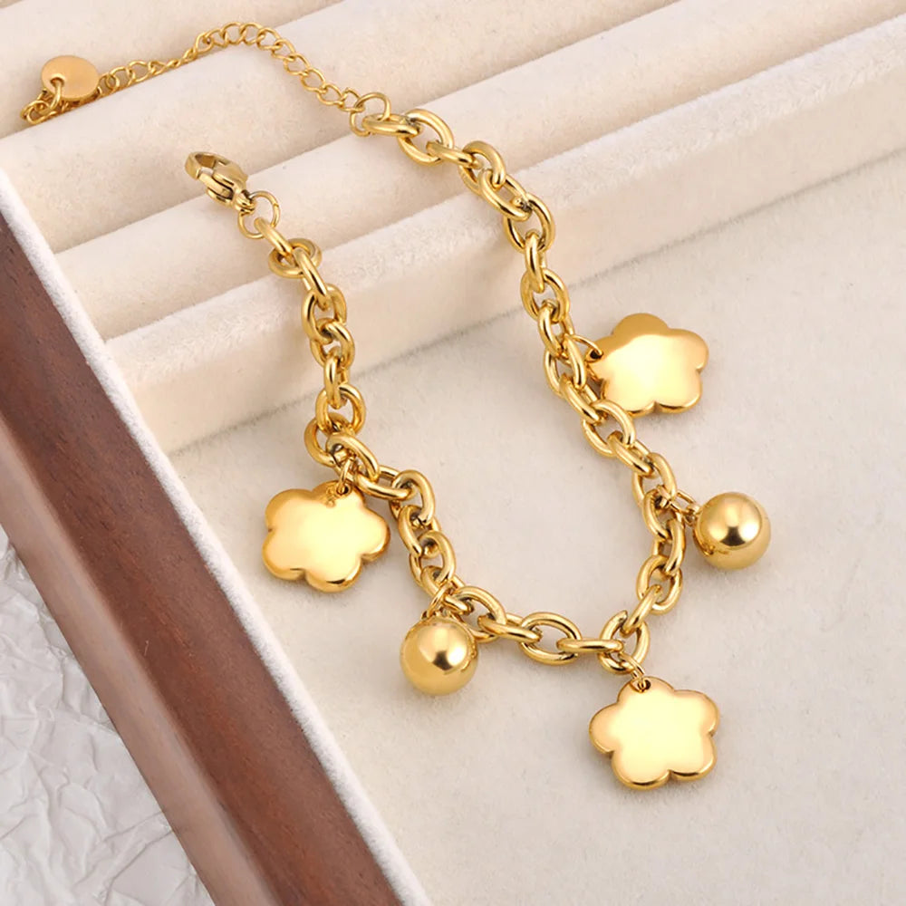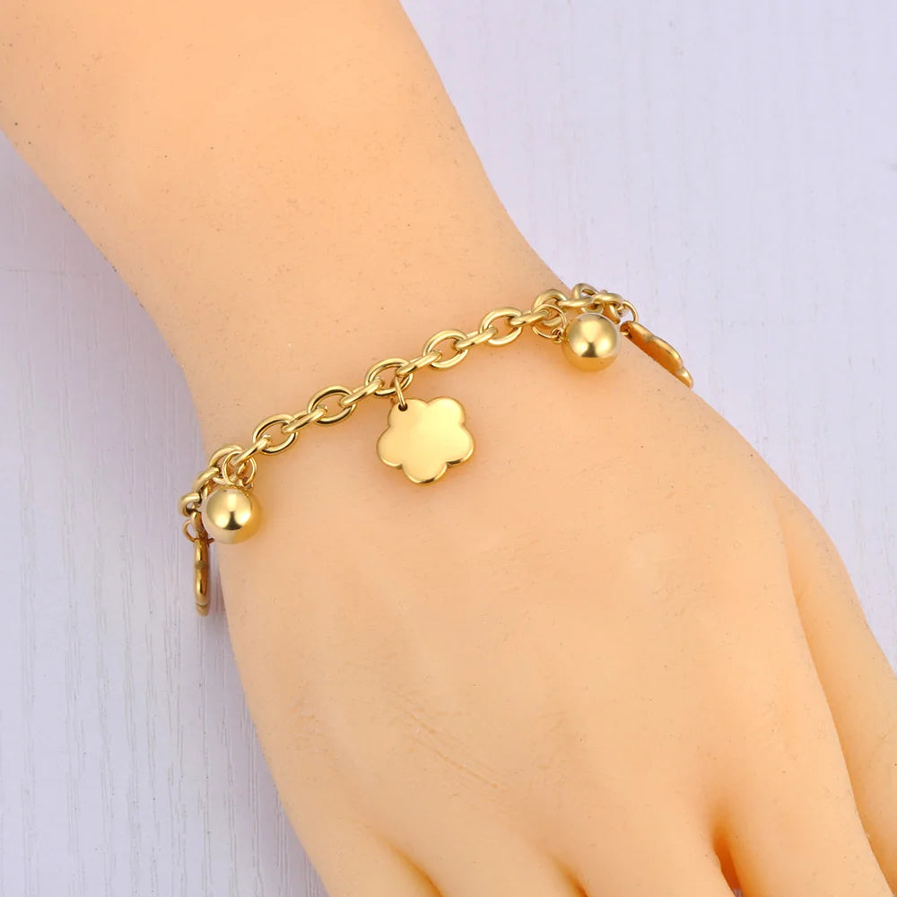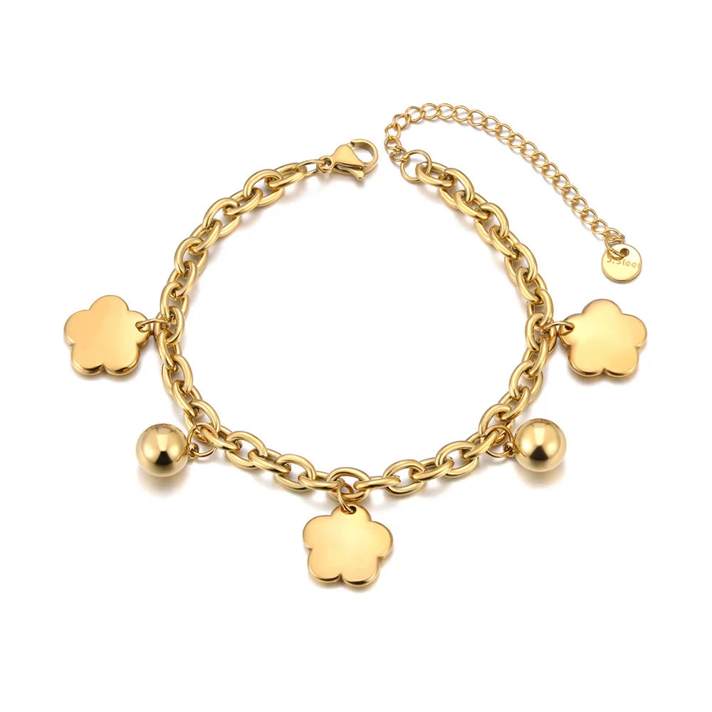 Avec une taille confortable de **17+3 cm**, le Bracelet à breloques doré avec trèfles et grelots est entièrement réglable, ce qui en fait un choix parfait pour toute morphologie. Son design unique, orné de trèfles porte-bonheur et de grelots délicats, apporte une originalité qui vous démarquera. Les rhinestones ajoutent un brin de glamour, tandis que l’acier inoxydable assure une longévité remarquable, résistant à toutes les épreuves du quotidien sans ternir ni se décolorer. Ces caractéristiques font de ce bracelet un accessoire incontournable pour les femmes modernes, désireuses de porter des bijoux qui racontent une histoire.