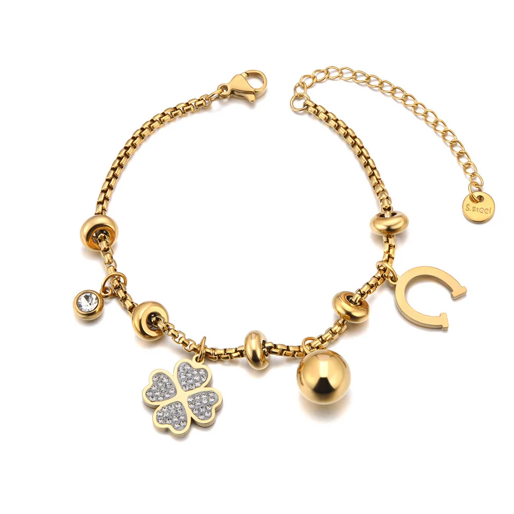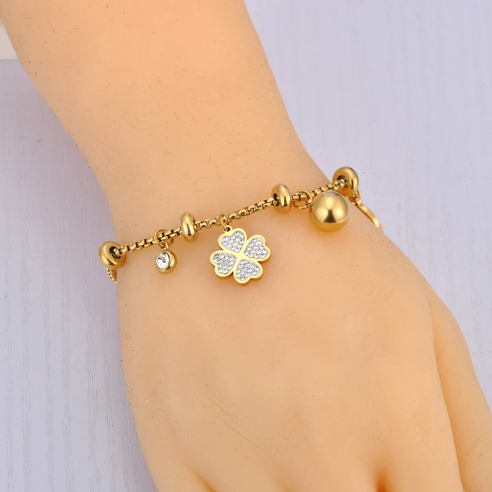 Bracelet à breloques doré avec clips et trèfle à 4 feuilles