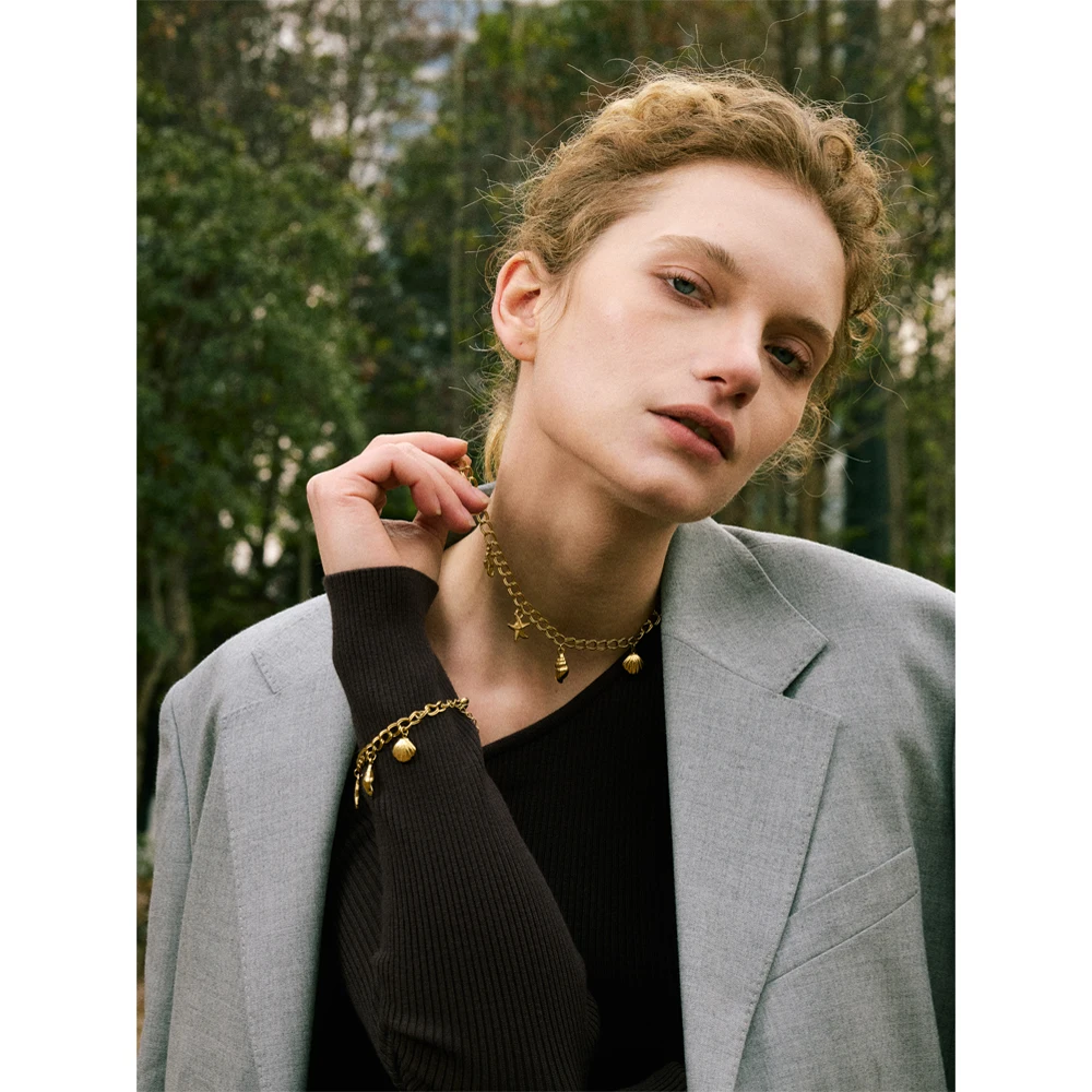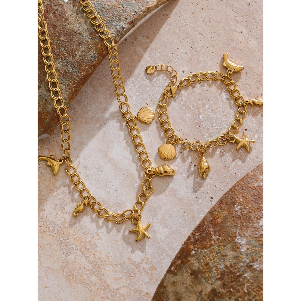 Le Bracelet breloques de la mer dorées se combine idéalement avec le collier assorti, créant une harmonieuse tenue de joaillerie qui ne passera pas inaperçue. Chaque breloque, soigneusement sélectionnée, représente des éléments marins, ajoutant une note ludique et rafraîchissante à votre look. Vous pouvez être certaine que ce bijou ajoutera une touche de sophistication tout en restant dans l’air du temps. Offrez-vous ou offrez à un être cher un bijou qui parle à l’âme, parfait pour célébrer l’été en toute simplicité.