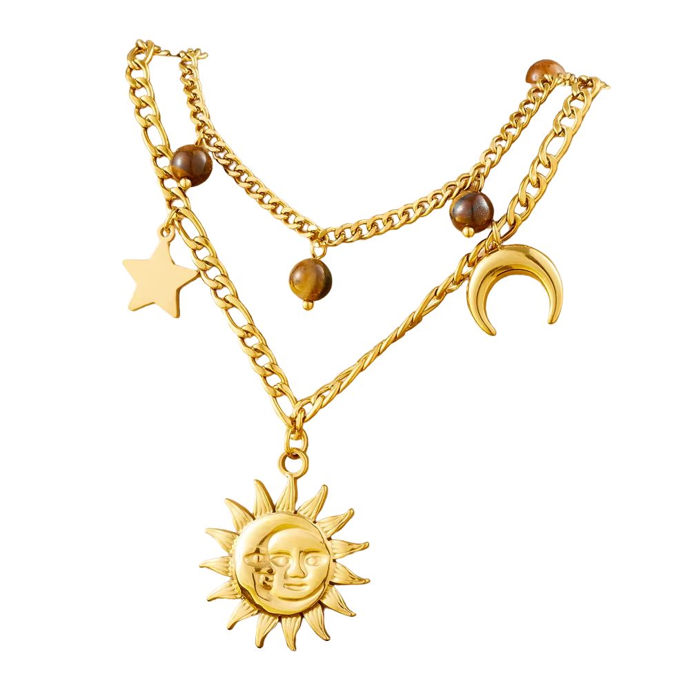 Vous cherchez une touche d’élégance et de mystère à ajouter à votre collection de bijoux ? Ne cherchez plus ! Notre collier à breloques avec soleil, lune et étoile doré est le bijou parfait pour toutes les occasions. Que vous souhaitiez illuminer une tenue décontractée ou ajouter une note de sophistication à un look de soirée, ce collier s’adapte à toutes vos envies. Avec ses motifs enchanteurs de soleil, de lune et d’étoiles, il évoque un univers cosmique unique qui ne manquera pas de faire tourner les têtes.