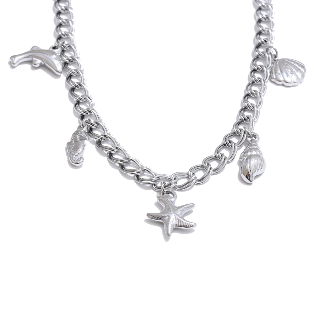 Découvrez le magnifique collier breloques de la mer argentées qui s’ajoute à votre collection de bijoux avec une touche de fraîcheur maritime ! Ce bijou, conçu spécialement pour les femmes modernes, est embellie de breloques inspirées de la mer. Que vous souhaitiez ajouter une note de sophistication à votre tenue ou faire sensation lors d’une sortie, ce collier saura répondre à toutes vos attentes. Fabriqué en acier inoxydable plaqué or réel avec une technique PVD, il allie durabilité et élégance, tout en étant dépourvu de produits chimiques nocifs. Avec un bracelet assorti inclus, c’est un duo parfait pour tous les amoureux de la mode.