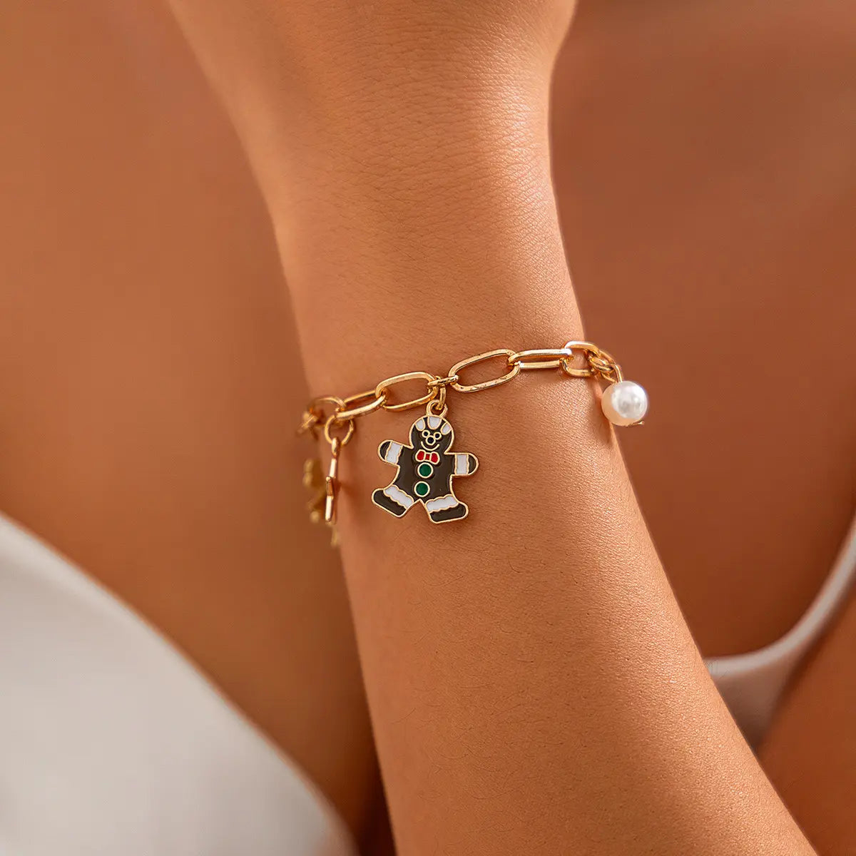 Si tu cherches à ajouter une touche festive et charmante à tes tenues, ne cherche pas plus loin que notre Bracelet à breloques de Noël avec biscuit. Ce joli bijou couleur or se distingue par son design amusant qui met en avant des breloques en forme de biscuit, parfaites pour célébrer la magie des fêtes tout en restant élégante. Fabriqué avec soin, ce bracelet combine harmonieusement des chaînes en fer, des perles imitations et un alliage, le tout rehaussé par une finition en huile goutte à goutte, ce qui lui donne un éclat irrésistible.