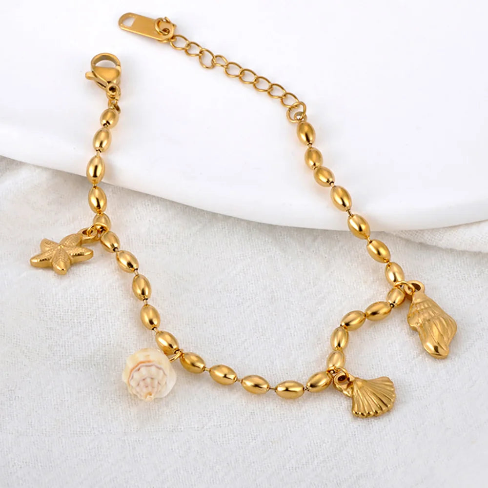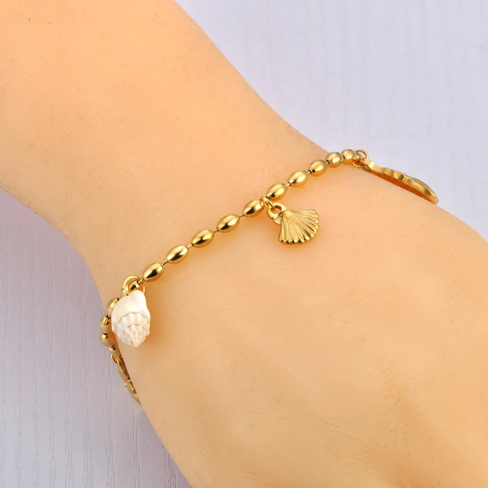 Découvrez notre bracelet doré à breloques avec coquillage, un bijou tendance qui rehausse votre style et apporte une touche d’élégance à n’importe quelle tenue. Ce magnifique bracelet en acier inoxydable, choisi pour sa robustesse et sa brillance, s’associe parfaitement à une variété de styles, qu’ils soient classiques, romantiques ou plus modernes. Avec sa chaîne en maillon box et un magnifique coquillage suspendu, ce bracelet est non seulement chic mais également unique, parfait pour les femmes qui veulent faire une déclaration sans en faire trop.