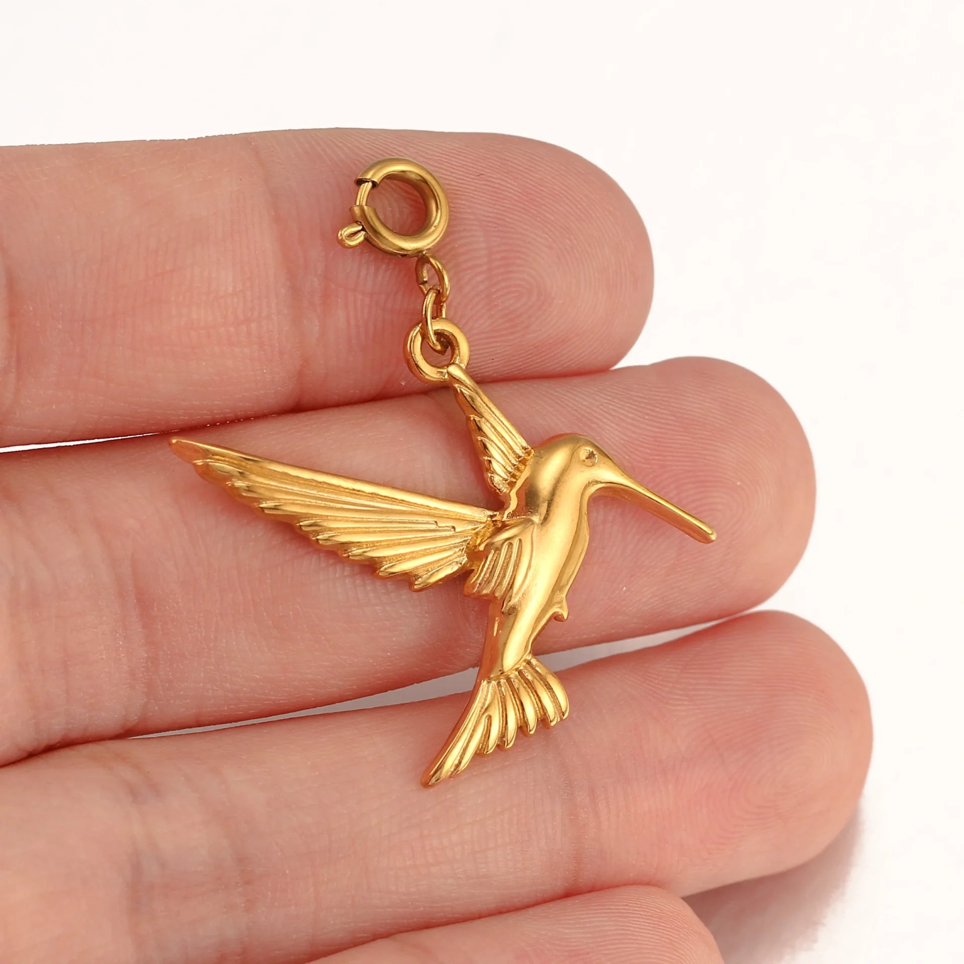 Découvrez notre breloque bijoux oiseau doré avec crochet, un accessoire incontournable qui ajoutera une touche d’éclat à vos créations. Fabriquée en acier inoxydable, cette magnifique breloque arbore une belle teinte dorée grâce à son plaquage en or 18K PVD. Elle est non seulement idéale pour la création de colliers, bracelets et boucles d’oreilles mais elle est aussi conçue pour être au cœur de tous vos projets de bricolage. Si vous aimez créer des pièces uniques qui reflètent votre personnalité, cette breloque est faite pour vous. Vous pouvez facilement la combiner avec d'autres éléments pour concevoir des bijoux qui captivent les regards.